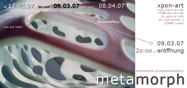 etwas altes geht und bereitet den nährboden für das neue, das kommt. in einem dynamischen prozess verwandelt sich die galerie stuhlmann in die galerie xpon-art. anna g.(punkt) und arne lösekann werden als neues galeristen-team rolf stuhlmann nach 22 jahren ablösen. sie beleben mit neuem konzept die etablierten ausstellungsräumlichkeiten des galerie cafe's. der schwerpunkt liegt auf thematischen gruppenausstellungen mit jeweils bis zu 10 künstlern. indem werke in verschiedenen ausdrucksformen, stilrichtungen und techniken ausgestellt werden, bemühen sie sich, dem publikum die bandbreite des jeweiligen themas nahezubringen. die erste thematische gruppenausstellung: "metamorph" um auf die morphose der galerie aufmerksam zu machen, werden am anfang dieser ausstellung(13.02.07 - 09.03.07) leere, bereits mit passepartout versehene rahmen im galerie cafe hängen. diese sind mit dem jeweiligen werktitel und namen des künstlers versehen, dessen werke ab dem 09.03.07 in den passepartouts erscheinen werden. an diesem tag (09.03.07) wird um 20:00 bei einem sektempfang die ausstellung eröffnet. danach bleiben die bilder bis zum 08.04.07 unverändert hängen und können ihre volle kraft entfalten.