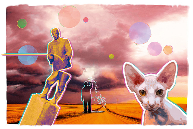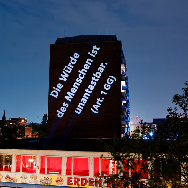 ![]() Es wird nicht einfach. Lässt sich überhaupt eine klare Situationsbeschreibung abgeben? Kann man, in dem Motiv „Weite Welt“, unter dem hypnotischen Blick einer Sphynx-Katze? Wird das Denkmal darin bereits demontiert oder nur noch notdürftig stabilisiert? Werden proaktiv bereits oberflächliche „Schönheitskorrekturen“ an einem drohenden Gewitter vorgenommen? Bei den Elementen in den Arbeiten von Dirk Brüggemann handelt es sich sowohl um reale Motive als auch um historische Dokumente, Zitate aus der Malerei, Literatur, Philosophie, Propaganda und Religion. Diese Augenblicke werden isolierter Intensität in mehrschichtigen, flüchtigen, transparent zerfließenden Farben in fiktiven Situationen collageartig kombiniert. Jenseits ihres eigentlichen Kontexts stehen schließlich vermeintlich eindeutige Bildaussagen frei in neuem Bezug zueinander und ursprünglich klare Aussagen werden aufgehoben. Diese Rekombination erzeugt eine schwermütige Leichtigkeit, die den Betrachter über ihre abgründige Situationskomik verstört reagieren lässt. Erst wenn es bei den zunächst gefällig und ästhetisch wirkenden Arbeiten von Almut E. Broër aus der Serie „ver - aus - graben 1942“ gelingt, sich auch auf hintergründig Gesehenes einzulassen, gelangt der Betrachter zur eigentlichen Frage und bezieht den Titel mit ein. Im Zusammenhang mit dem Material auf schwarzem Papier weist beides auf Morbides, Vergrabenes und somit auf Aufgegrabenes hin. Die Arbeiten sind der Versuch einer würdigen Erinnerung an die 1942 durch die „Aktion Reinhard“ systematisch ermordeten Juden und Roma. 180 Tage projizierte ST Kambor-Wiesenberg den „Artikel Eins“ des Grundgesetzes auf die Giebelseite des Hauses Königsstraße 8 in Richtung Nobistor auf dem Hamburger Kiez, wenige Meter von der Reeperbahn. 10 Meter hoch, 9 Meter breit. Jeden Tag von Sonnenuntergang bis 2:15 Uhr morgens. Es gab keine Reaktion darauf. Nicht einmal eine Beschwerde. „Können wir uns der Grenze zwischen privaten und öffentlichen Aktivitäten in unserem Leben bewusst sein? Ist das schwieriger, wenn das Subjekt derjenige ist, der schafft? Hat meine Großmutter beim Weben in ihrem Zimmer jemals gedacht, dass ihr Leben durch die Herstellung dieses Stücks Stoff auf dem Webstuhl von einem privaten in ein öffentliches Leben verwandeln würde (das für sie zu dieser Zeit unzugänglich war)?“ fragt Bojana Fuzinato mit ihrer soft sculture „PRIVATE and/or PUBLIC“. Eine Zeitschaltuhr bringt einen Eisblock für unterschiedlich lange Zeiträume zum Tauen. Einen Eisblock mit Gestalten darin: „Hey, wir sind auch noch da!“ Hoffnung, immer wieder aufs Neue. Dann wieder Frost. Eine Installation von Lars Röper. Inwieweit beeinflusst das autobiografische Gedächtnis die Wahrnehmung von Bildern? Und wie kann das Erinnerungsvermögen die Vergegenwärtigung von Bildern manipulieren? Mit diesen Fragestellungen beschäftigt sich Michael Schwarze in seiner Arbeit „Family Karma“. Eine intensive Auseinandersetzung mit Erinnerungen und der Einsatz von Cut-Up-Techniken sind dabei die Grundlage für seine fragmentarische Bildwelt. Die Fotoserie „STAUB/DUST“ von Michaela Schwarz ist ein Rundgang durch das Haus ihrer Kindheit, das sie 17 Jahre nicht betreten hatte. Die Gegenstände in diesem Haus standen, lagen an den gleichen Orten, nichts war verändert oder umgestellt worden, nur Staub hatte sich auf die Gegenstände gelegt. Was treibt uns an? Wonach sehnen wir uns und warum? Der 18-minütige Kurzfilm „Road“ von Alexandru Mihai Budes ist eine allegorische Repräsentation eines Weges, der allen vertraut ist, sich aber dennoch der Universalität verweigert. Gezeigt wird eine persönliche Sichtweise, eine Option, eine Wegabzweigung von vielen. Ein Wanderer bereist den Weg menschlicher Emotionen, auf und ab, in einer Welt voller Bedeutung und Symbole. Je höher der Aufstieg, desto tiefer kann der Fall sein. Anton Schön und Alexander Endrullat verbindet das Studium der bildenden Künste in Dresden. Seit 2018 arbeiten sie neben ihrer eigenständigen künstlerischen Arbeit auch zusammen an Malereien. Ihre gemeinsamen Werke tragen die eigenwillige Handschrift beider Künstler. Schöns Stil ist meist altmeisterlich figürlich. Endrullat hingegen arbeitet mit Schrift und Witz. Basis der Zusammenarbeit ist das Vertrauen für einen offenen Umformungsprozess durch die künstlerische Sprache des anderen.