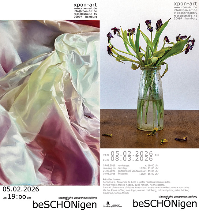 beSCHÖNigeneine thematische gruppenausstellung zeitgenössischer kunst eröffnung ::: 05.02.2026 ab 19:00 uhr ausstellungsaduer :: 05.02.2026 - 08.03.2026 performance ::: 21.02.2026 19:00 uhr öffnungszeiten ::: montag, dienstag, samstag und sonntag von 18:00 - 21:00 uhr finissage ::: 08.03.2026 von 11:00 - 16:00 uhr