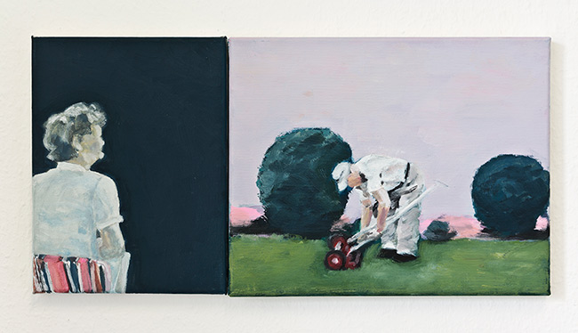 im diptychon „cut the lawn together“ von güde renken geht es um glattgebügelte außenwelt, um ordnung und kontrolle, wo eigentlich wandel und ungewissheit herrschen. der akkurat gemähte rasen und die zufriedene beobachterin stehen für ein bedürfnis nach perfektion und stabilität im alltäglichen und stehen im widerspruch zum wilden und ungeordneten, das sich auch im strich zeigt, und zugleich lebendiger wirkt.