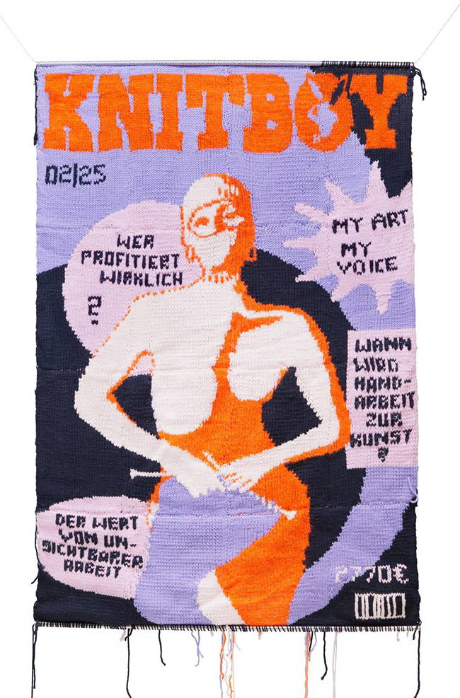 gegenüberstellungen durchziehen die arbeiten von hannah uhlmann. was bleibt von handarbeit und care, wenn das material selbst nicht mehr vorhanden ist? ein handgehäkeltes textil mit dem wort „soft“, einer technik, die mit fürsorge, wiederholung und körperlichem wissen verbunden ist, wird in porzellan eingetaucht und gebrannt. was bleibt, ist eine fragile hülle, die nur noch die struktur bewahrt. einer weitere gruppenarbeit zusammen mit christina kampmann, eva-maria weikert und nora von zahn thematisiert historisch unsichtbare care-arbeit und dessen geschlechtsspezifische ausbeutung und positioniert stricken neu als politisches und künstlerisches medium, das traditionelle rollenbilder bricht und soziale verbindung schafft.