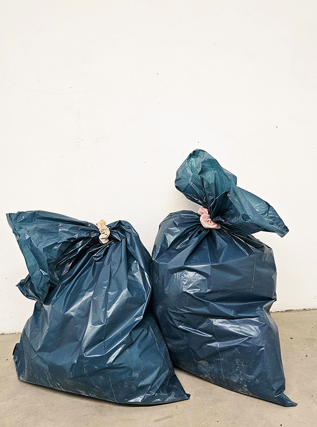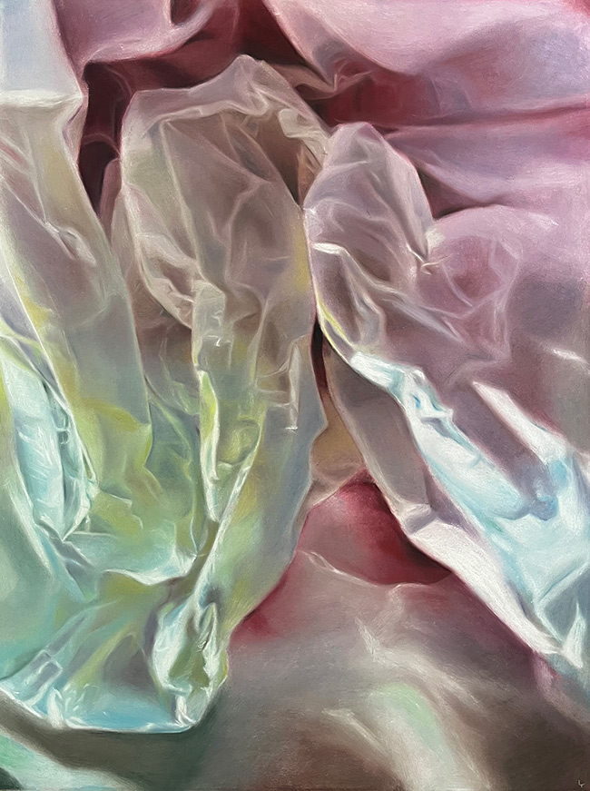 auch die arbeiten von luka topp zeigen, in pastellkreide auf leinwand, alltägliche materialien. in diesem falle plastiktüten als ästhetische phänomene. während es einerseits um eine bewusste neubetrachtung mit einem fokus auf strukturen, reflexe und transparenzen geht, den blick auf qualitäten lenkend, die im täglichen gebrauch kaum wahrgenommen werden, wird andererseits hinterfragt, wie schnell wir bereit sind negative aspekte auszublenden, wenn uns etwas visuell verführt.